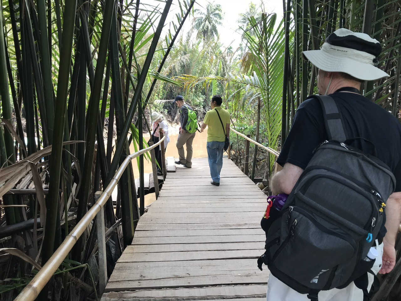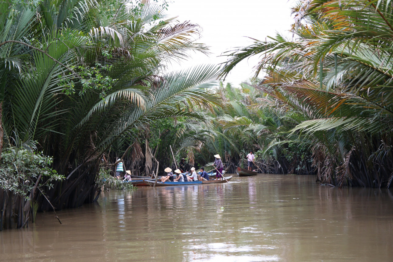 삼판 보트에 탑승하여 코코넛 운하를 따라 유람
