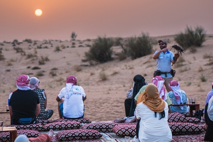17:30 사막 일몰 포인트 도착 후 일몰 감상, 사진 촬영 및 팔콘 시연 관람.