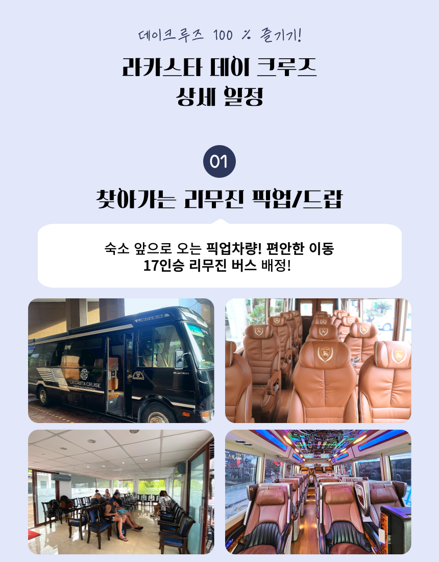 이렇게 상품에 대한 간단한 설명을 드렸구요. 저희 아이러브베트남에서는 정확한 정보 전달을 위해 당연히!!! 해당 크루즈를 직접 방문하고 있습니다. ! 주의 ! 저희처럼 상세한 설명이 없다면 직접 다녀오지 않고 판매하는 경우가 많으니 주의하세요 그럼 여행 일정을 세세히 살펴보도록 하겠습니다~ 레츠 고우!!!👉👉 * 지금부터 이하 내용들은, 당일 크루즈 현장 상황에 따라 예고 없이 변경될 수 있습니다.