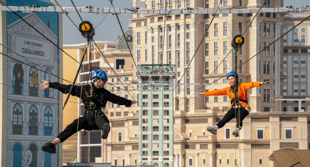 리스보에타 마카오 코타이에 위치한 짚시티(ZIPCITY)에서 낮이든 밤이든 5개의 짚라인에 친구, 가족과 함께 몸을 실어 388m 높이에서 하늘을 가로질러보세요. 특히 밤이 되면 타워와 플랫폼, 케이블과 착륙 구역이 LED 조명으로 밝아지는 전망을 즐길 수 있으며, 아드레날린을 자극하는 맞춤형 사운드 트랙도 제공됩니다.