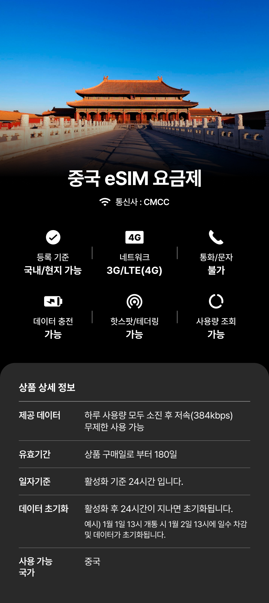 [중국] eSIM 데이터 무제한 (4GB)