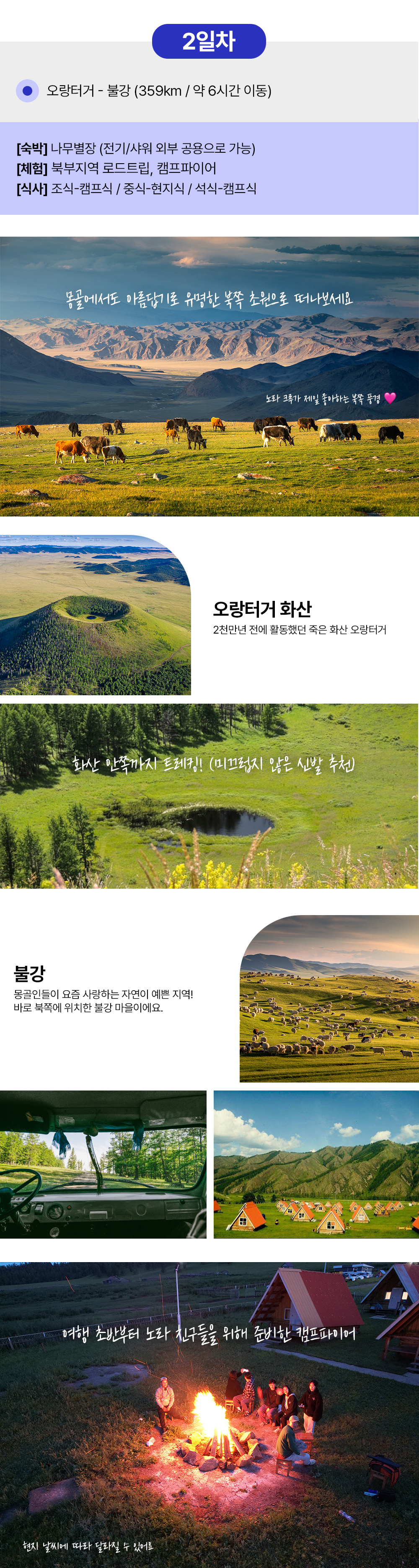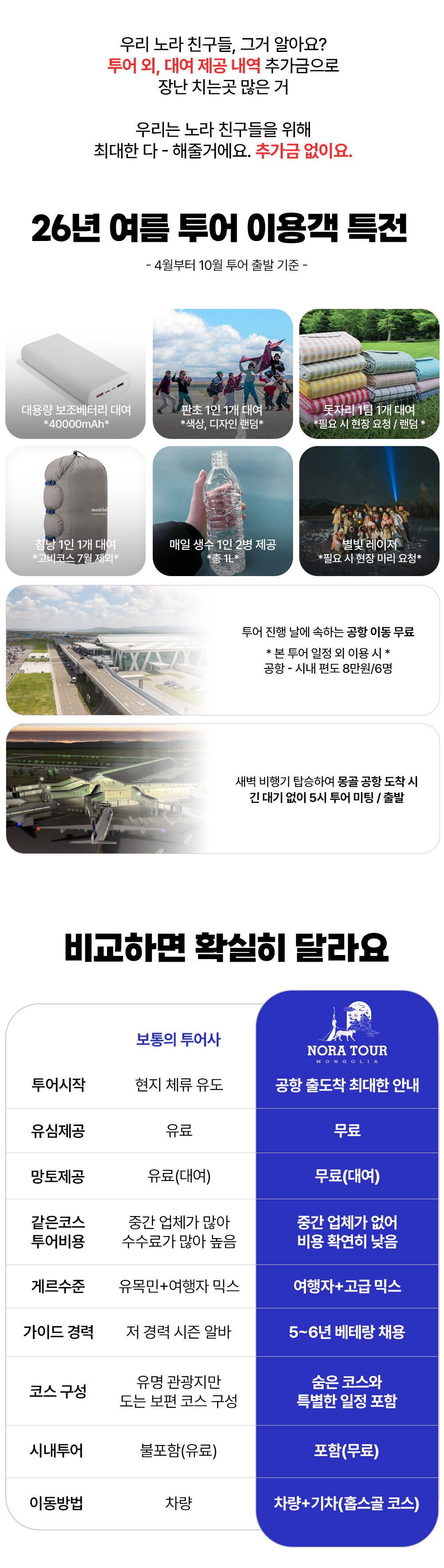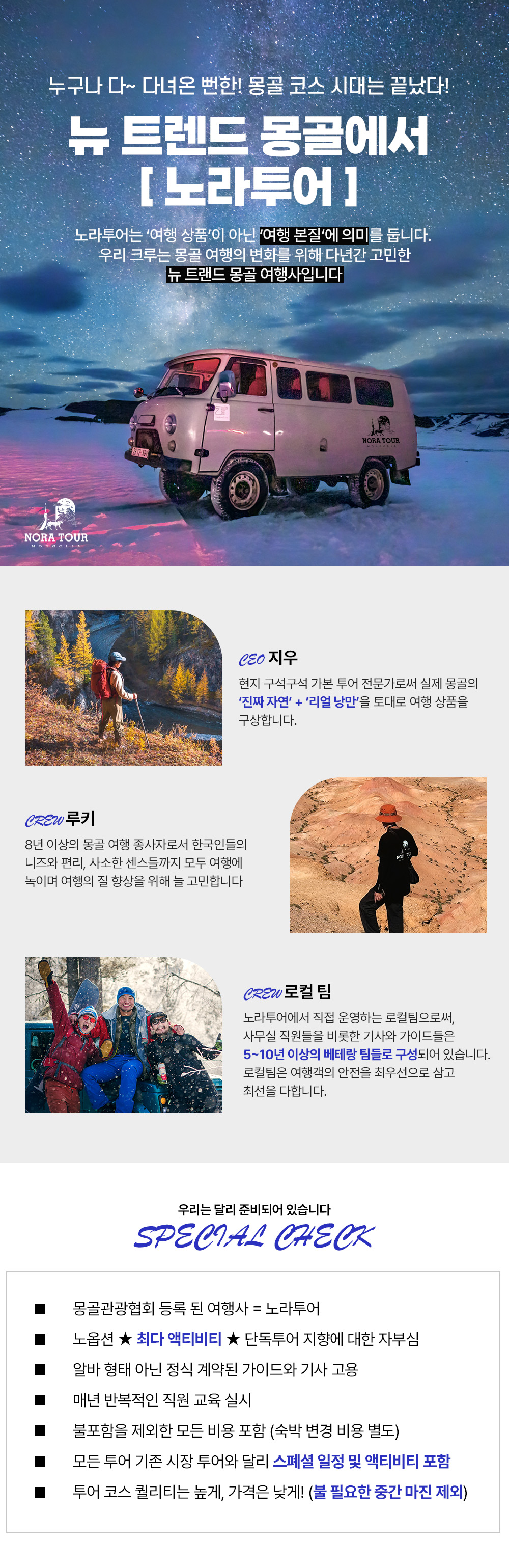 이 여행을 더 완벽하게 만들어주신 분은 바로 미나 가이드님이세요!! 정말 친절하시고, 여행지마다 소소한 이야기와 스토리를 들려주시는데, 덕분에 몽골에 대해 더 많이 알게 되었어요. 게다가 작은 부분까지 세심하게 챙겨주셔서 진짜 마음이 든든했답니다. 식사 시간이나 이동 시간마다 불편한 건 없는지 항상 확인해주셔서 정말 감사했어요! 그리고 기사님도 너무 든든하셨어요! ^^ 먼 길을 안전하게 잘 운전해 주시고, 항상 밝은 미소로 맞아주셔서 덕분에 이동 시간도 편안하고 즐거웠답니다.
