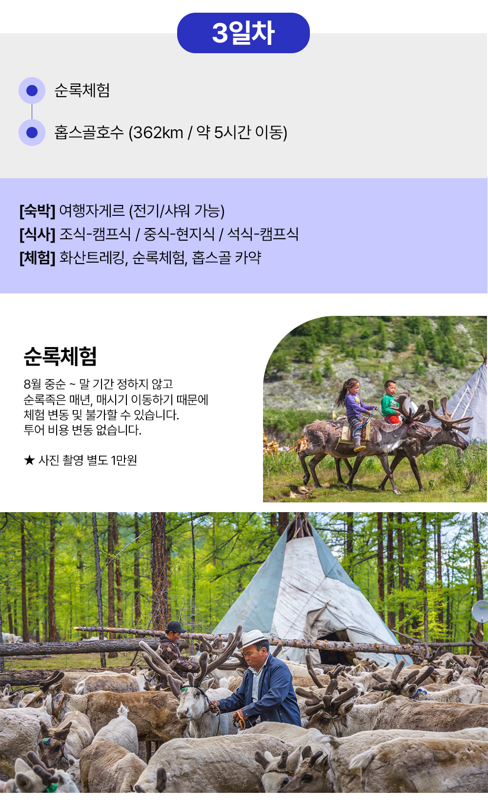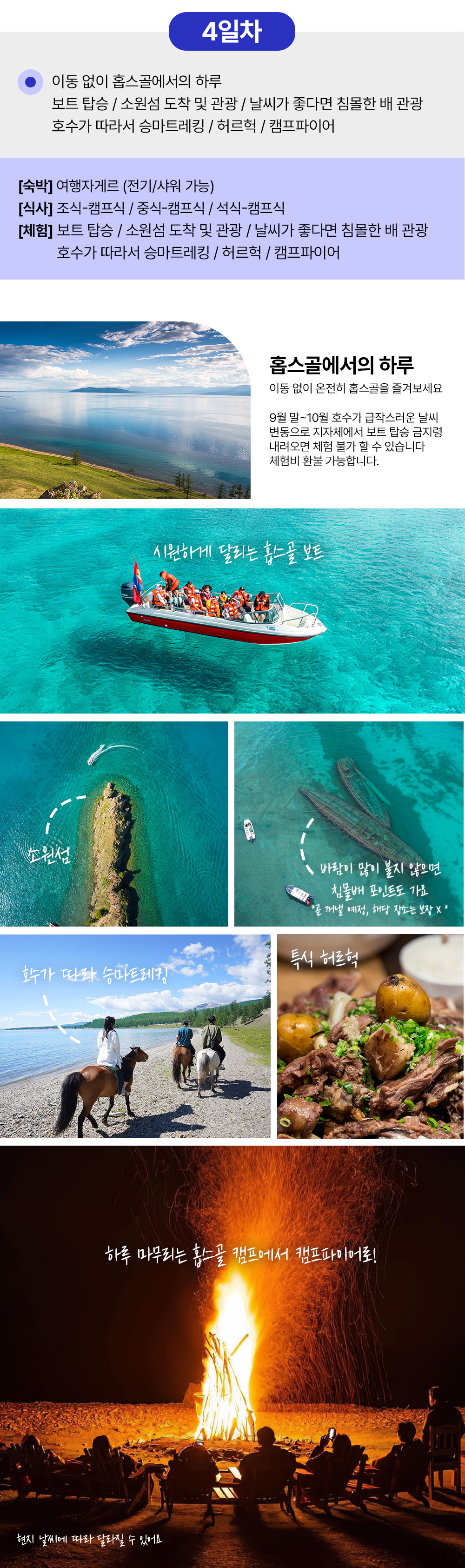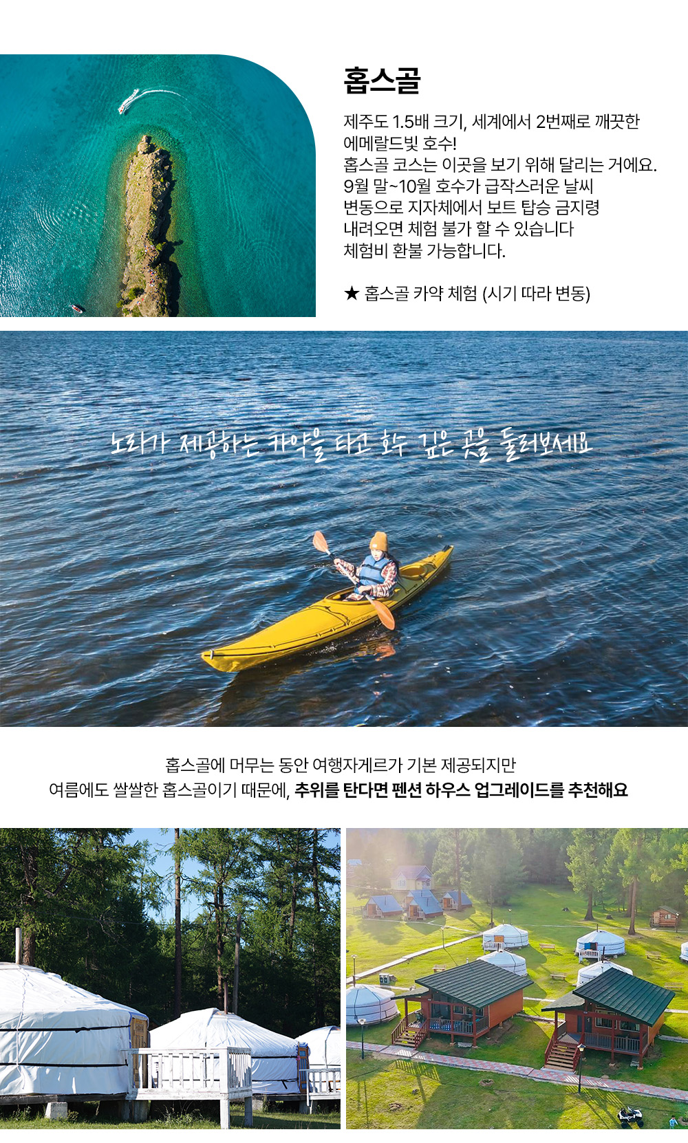 홉스골이라는 몽골의 호수에서 보트도 탔어요! 그 호수는 정말 맑고 깨끗해서 한 폭의 그림 같은 풍경이었어요. 보트를 타고 시원한 바람을 맞으며 호수를 가로지르는 기분은 정말 말로 다 표현할 수 없을 정도로 상쾌했답니다 ^0^ 그리고 말, 낙타, 소까지 타는 체험도 했는데요! 동물들과 함께하는 시간이 정말 특별했어요. 평소에 쉽게 접할 수 없는 경험이라서 더 신나고 재미있었어요 ^.^ 이런 다양한 액티비티 덕분에 여행 내내 지루할 틈이 없었어요.