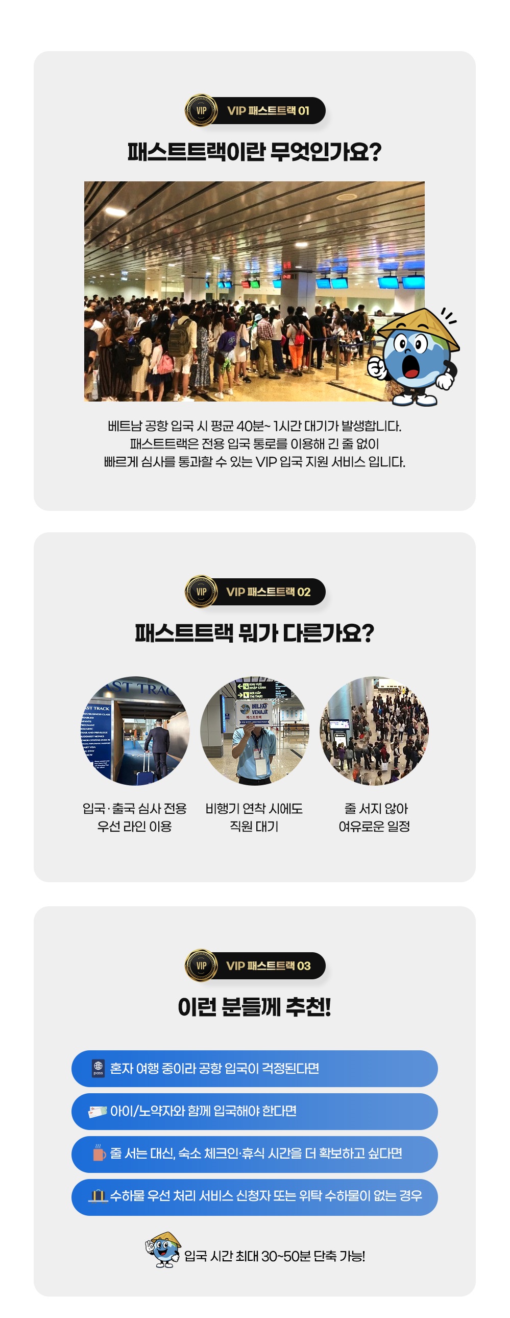 VIP 패스트트랙 서비스를 이용하시면, 항공사 직원들이 사용하는 전용 라인을 통해 빠르고 편리하게 입국심사를 마칠 수 있습니다.